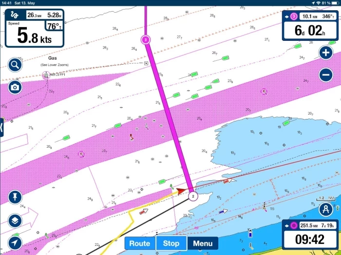 Shortly after passing the first TSZ (Terschelling), an oil platform called us on VHF and asked whether we knew that there was a 500-metre exclusion zone around it. At that point, we were 1.2 nautical miles away. We replied that we hadn’t known but would adjust our course accordingly. He thanked us and wished us a safe journey. After sunset, we passed through the second traffic separation zone (TSZ German Bight Western Approach). For us, that was one of the most thrilling moments of crossing the North Sea: at night and through these heavily trafficked “sea motorways”. Unimaginable without AIS.