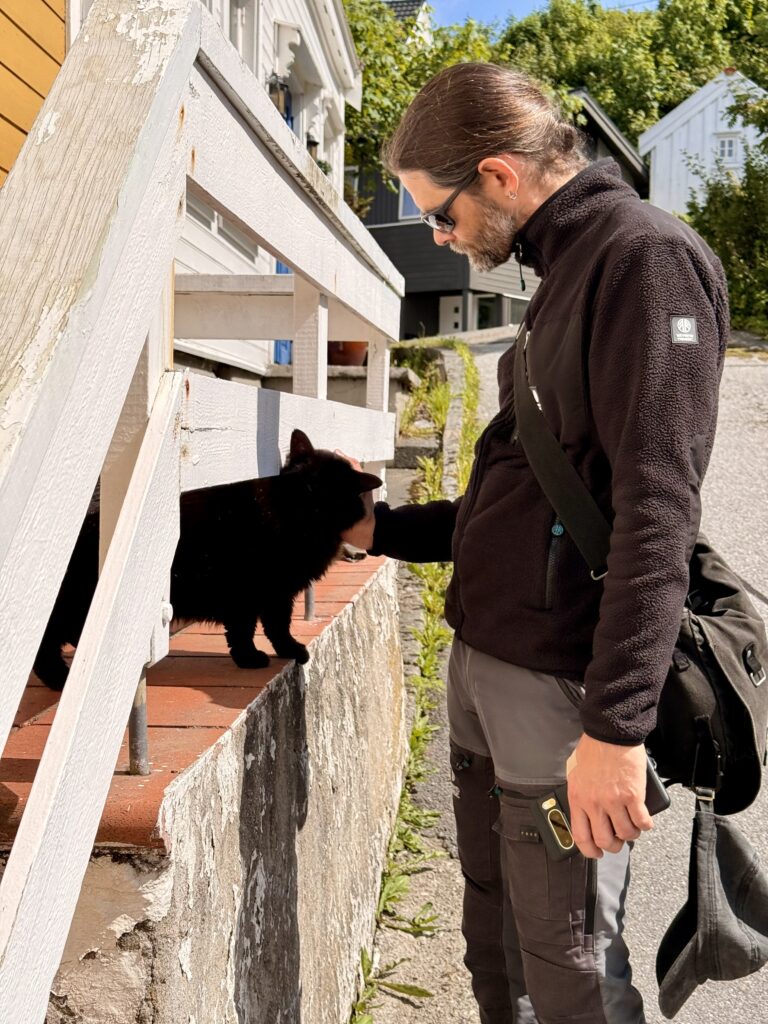 The wind had eased overnight, but there was still quite a swell running in Sildegap Bay. Unfortunately, it was once again less wind than forecast, so we had to motor around Stattlandet. Sadly, the ship tunnel that Norway is planning, to make passage around this very exposed cape safer, was not yet finished in 2025. Just before Runde – luckily not out at sea and not in the harbour either – the engine suddenly cut out. Empty tank, that was quickly clear. We had calculated a bit too tightly and assumed we’d be able to sail more. So we rolled out the small cutter sail and I motored back and forth in front of the harbour at Runde while Tommy filled the tank and bled the diesel line. Our fuel gauge isn’t exactly reliable. The analogue sender sometimes sticks and shows more than is actually in the tank. We’re now logging engine hours in the logbook. That won’t happen again. Lesson learned.