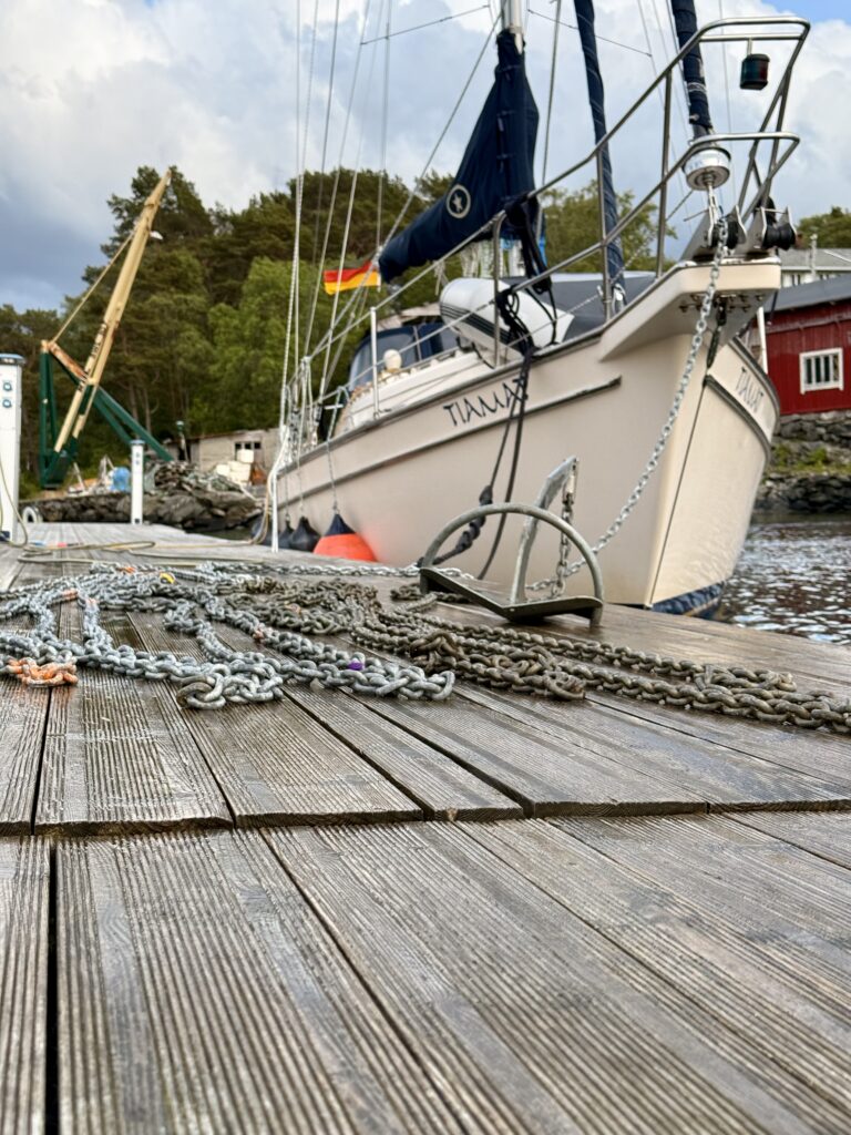 After work we waited until the rain had stopped and then set off towards Florø. We were able to enjoy some lovely downwind sailing as far as Askvoll. In the narrow fjord, however, the wind then blew straight on the nose. We had chosen the small island for the coming stormy days because it is very well sheltered. A good decision, as it turned out. It wasn’t just windy – it absolutely poured for two days. Even though it wasn’t really a proper harbour or even a village, the jetty had quite a lot to offer. Directly opposite was a small 24-hour supermarket, and for the modest mooring fee you were even allowed to do your laundry for free. So we made good use of the time. We also got our anchor chain ready for the summer.
