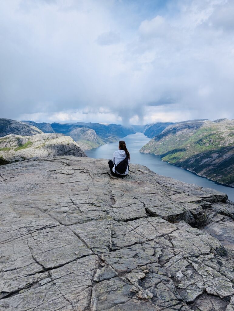 In the beautiful island world around Stavanger, everything is relatively close together. So our trip to Jørpeland was hardly worth mentioning. We had only chosen the place because from there you can take a short bus ride to Preikestolen BaseCamp. Even though we had heard horror stories about crowds of tourists dragging themselves up the steep mountain paths, we did not want to miss the view over the Lysefjord from up there. It was still pre-season and already late afternoon when we set off. We had snow, rain and sunshine. But only a handful of people on the trail and even fewer up on Preikestolen with us.
