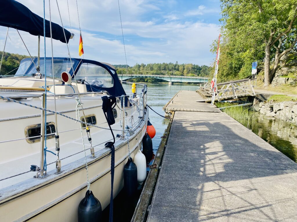 Off we go through the Trollhätte Canal. The canal route is 82 km long in total, but only around 10 km of that is man-made waterway; the rest follows the natural riverbed of the Göta älv. Unlike the Göta Canal, it isn’t run by a special company but by the Swedish Sjöfartsverket. Along the way there are 12 bridges, 3 of which cannot be opened. With six locks – one at Lilla Edet, four connected chambers at Trollhättan and one at Brinkebergskulle – you cover a total height difference of 44 metres down to the Kattegat. The canal fee of 1,200 SEK (around €100) is paid at the first lock or at the canal office in Trollhättan. There’s also a museum there.