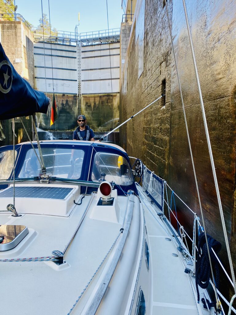 First thing in the morning comes the big lock staircase in Trollhättan: 4 enormous chambers, each compensating for an 8-metre difference in height. It looks impressive, but the actual locking through is easy. You simply hold on front and back with a boat hook on the ladders. Sadly, we had to wait 2 hours in the first chamber before locking through. Commercial shipping has priority, and of course a giant ship had to squeeze in just ahead of us.